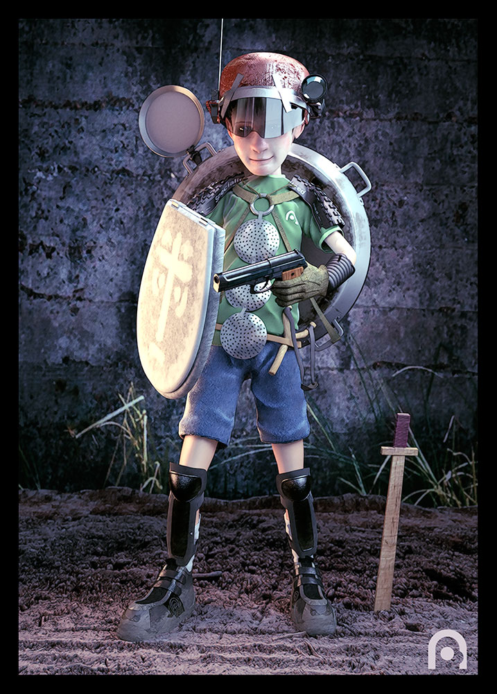 A mí me transmitió otra cosa, no me impactó de la forma que estaba previsto. Me transmite más incoherencia que impacto o sorpresa, y siento decírtelo así. Intentaré explicar el por qué. El render es estático, es como una postura para una fotografía. No hay dinamismo, ni paso del tiempo, ni algo que insinúe una cierta evolución hacia el mal camino, que en este caso sería la pistola. Por cierto, una pistola muy real, limpia y que desentona un poco del resto de la imagen. En mi opinión, lo ideal hubiera sido una pistola de madera, o bien una de plástico con ventosa como comentó otro compañero. Quizás así, poniendo más armas de juguete hubieras conseguido el impacto que comentas, por lo menos para mí.