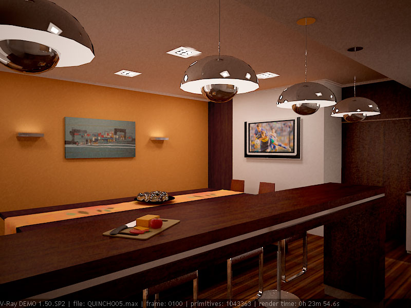 Hola, bueno, por ser tu primera vez en subir, bastante bien se ve, no obstante, dado que pides opiniones, te comento que las luminarias, se vén faceteadas, le faltaría un suavizado de malla, te sugiero ajustar las texturas en general, también hace falta Bump en la madera de la mesa, el camino de tela sobre ella, en fin.Cita: