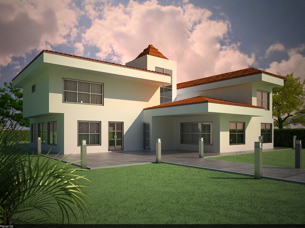 Hola necesitria que me den algunos consejos para mejorar esta vista exterior, está modelado en AutoCAD y renderizado en 3ds Max con Vray, no sé por qué salen esas manchas blancas en las ventanas y los puntos en la vereda si alguien sabe estaría agradecido que me explique, también algunos consejos para ambientar mejor la imagen y que quede más real, bueno saludos.