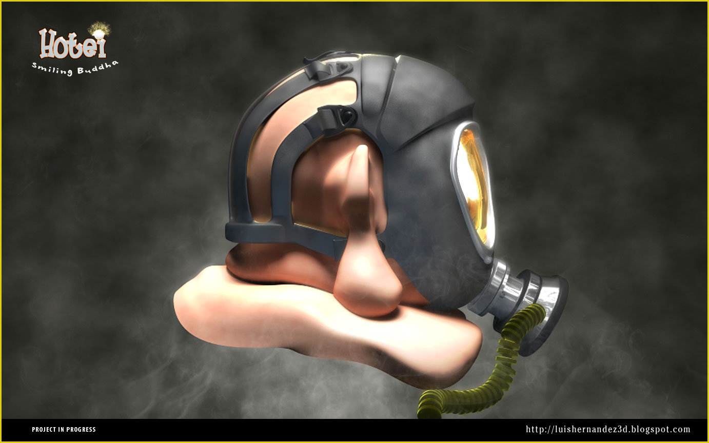 Gracias a ambos, lo de la máscara es una protesta que hice en cuanto a la contaminación. La cosa va de que sucedería si buddha o hotei (que en algunas religiones es llamado así o el buddha sonriente), viviera en China que es el país con mayor índice de contaminación, de hecho el fondo que hice es la ciudad de nanjin, algunos elementos del buddha son utilizados por los hindúes, como es el caso del tilaque o punto rojo en el entrecejo, mezclando así la misma imagen icono-religiosa y generalizando la situación a nivel mundial.