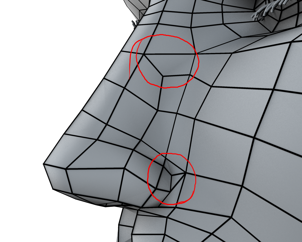 Subo el wire de la nariz para que le exeis un vistazo cuando podáis, e marcao dos zonas en rojo porque no sé exactamente a que parte os referis, en la de más abajo ay un triángulo y parece que se ve una tensión rara, y pongo también un render de las pestañas para que veáis cómo queda más o menos, tendría que ajustarlo mejor, pero es para que lo veáis así por encima, el tema de las manos ya se lo he retocao se las e ensanchado un poco, gracias.