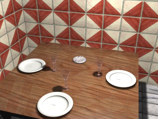 No sé quién se va a sentar a esa mesa, parece un poco baja, ¿o van a ser chinos que usan cojines? La verdad, lo único que me gusta en tu escena son las copas de vino, pero la sombra no cuadra con el material Glass. Saludo de Andrés.