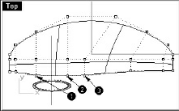 9 para obtener un control más localizado sobre los puntos de control (nodos) de la superficie, utilice el comando insertknot para añadir una fila de puntos en la dirección v entre la parte inferior y la fila de puntos siguiente. Con el comando insertknot, los puntos de control (nodos) pueden añadirse en la dirección u, v o en ambas. Cuando sea posible, trate de colocar nuevos puntos de control entre las líneas de puntos existentes que quedan resaltadas durante el comando.
