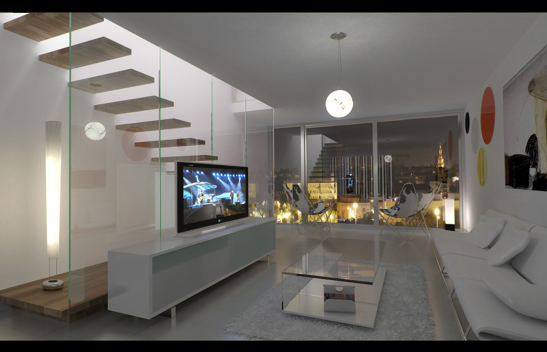 Hola, soy nuevo aquí, pero igual me tomo la libertad de criticarte, espero no te moleste, creo que le faltaría algún soporte en la parte del vidrio atrás de la tele, esa imagen de fondo esta buena, con un poco más de trabajo podría acoplarse bien, lo que se ve raro es el reflejo de esa cortina creo que es, puedes darle más caña, me gusta la luz. Saludos.