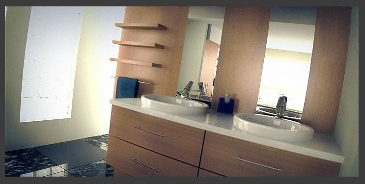 Aquí les dejo un render de un baño, el modelo está basado en la línea Laufen. Render en Vray con cámara ojo de pez, la imagen está tratada en Adobe Photoshop (color, grano y Dof).