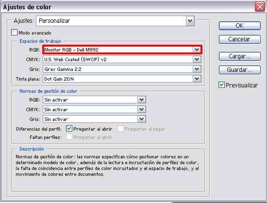 Endora, los ajustes del Adobe Photoshop son propios y no sirven para otros programas, y la simulación CMYK que tienes puesta no la entiendo.