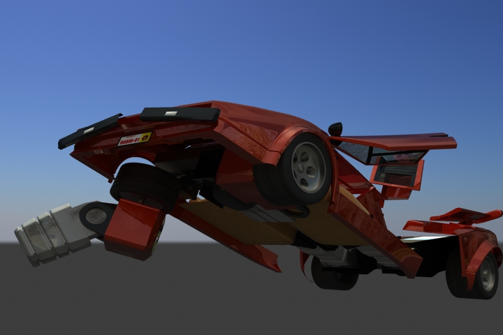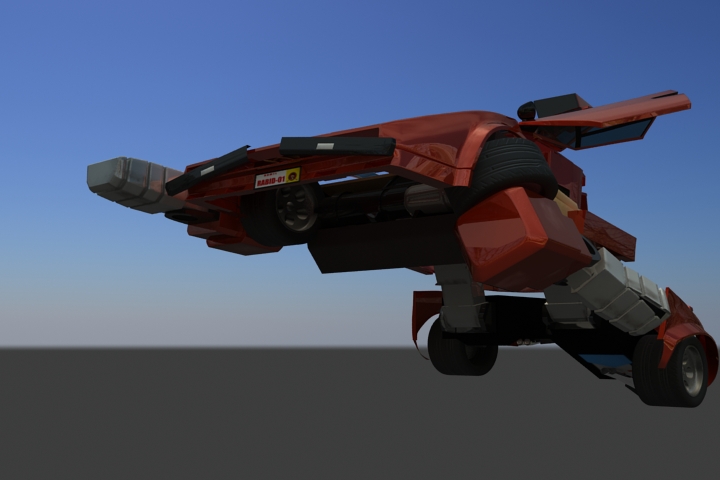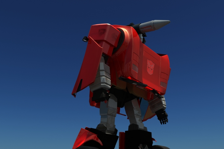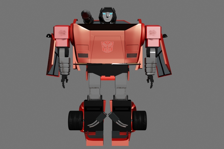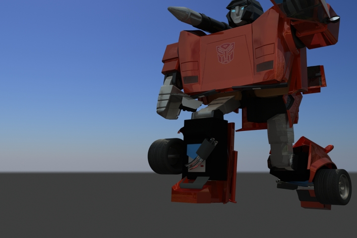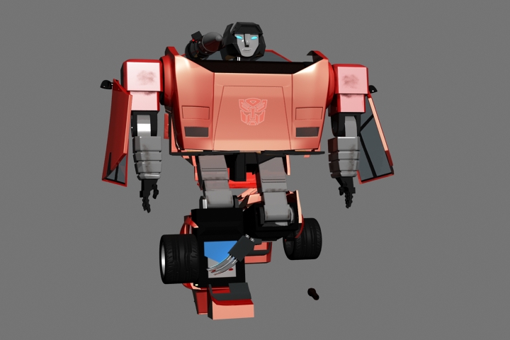 Bueno, no será el Transformer más estético jamás constuído, pero vale para probar mi teoría inicial de que los Transformers g1 (los que la mayoría de nosotoros veíamos en los 80) no pueden transformarse como lo proponían sin sacrificar realismo o estética. El ancho del auto le da un aspecto bastante cómico a nuestro conejillo de indias sideswipe. Aunque le falta bastante trabajo de rigging, ya me reivindicare luego construyendo un skywarp g1 fiel al dise;o del dibujo original, intransformable eso sí.