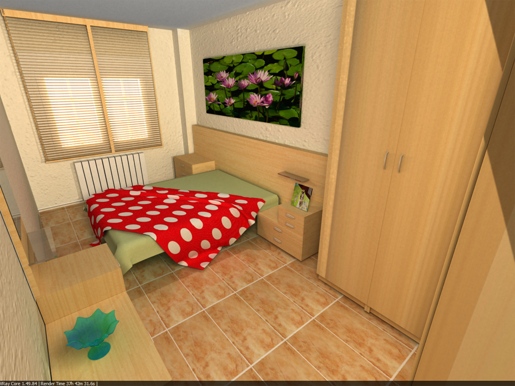 Hombre si solo querías ver cómo te iban a quedar los muebles, está bien, aunque si buscas más realismo, tienes cosas que mejorar. Por ejemplo, el gotelé de la pared es un poco exagerado, debería ser más pequeño. Por otro lado, el angular de la cámara está demasiado forzado y deforma mucho la imagen. Luego en cuanto a la iluminación, parece que viene desde arriba, te recomiendo que uses fuentes de luz indirectas y no tan duras. No sé qué motor de render has usad, pero simulando una luz del sol exterior con GI, haría que ganra muchísimo la imagen.