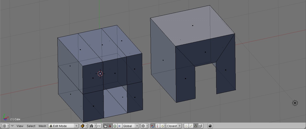 Para hacer el hueco de la puerta o ventana, yo borraría solo la cara y extruiría los vértices hacia dentro. Luego es cosa deajustar los nuevos vértices para situar la ventana o la puerta e incluso la forma.