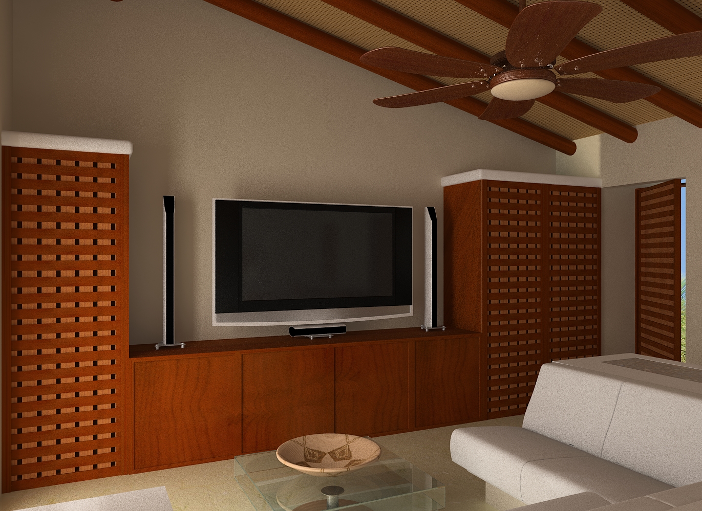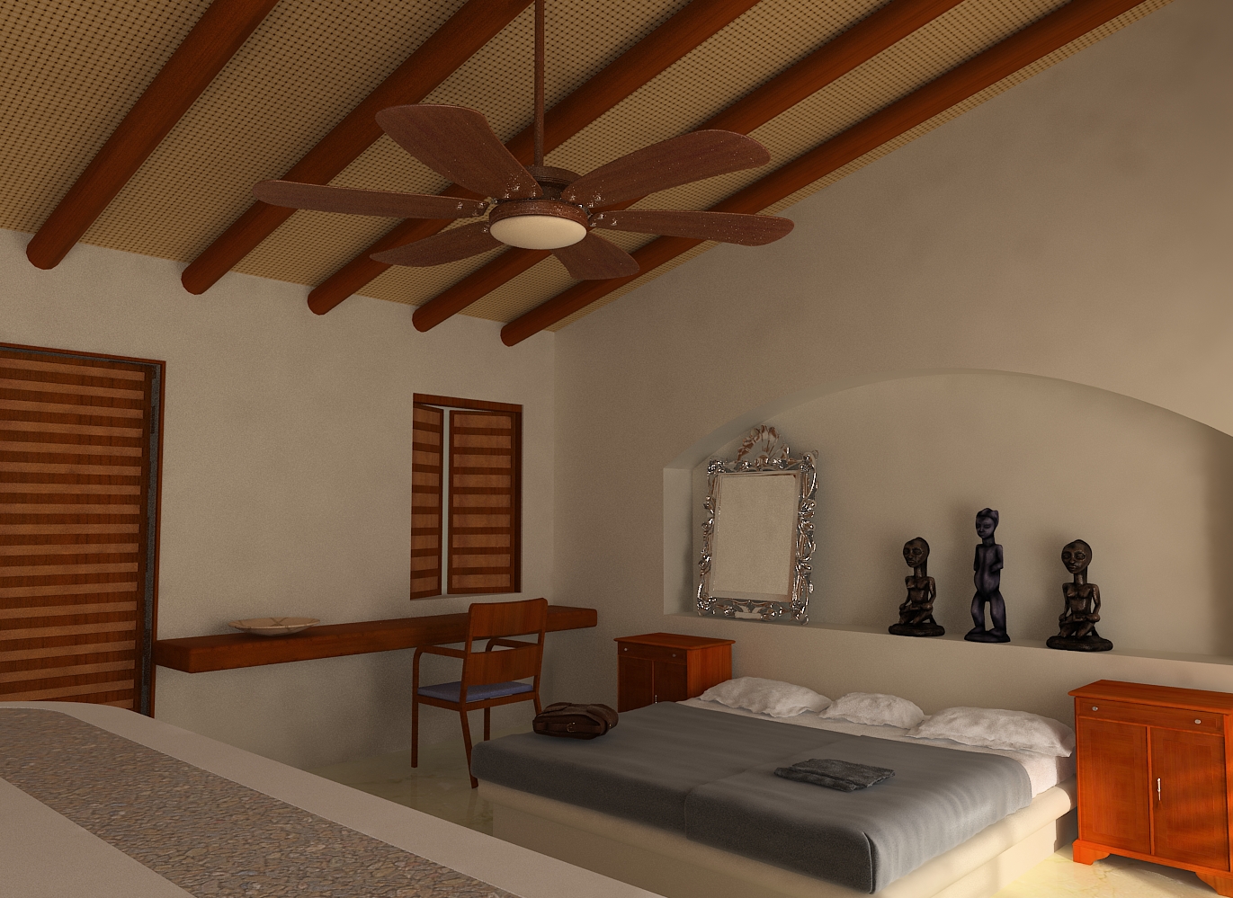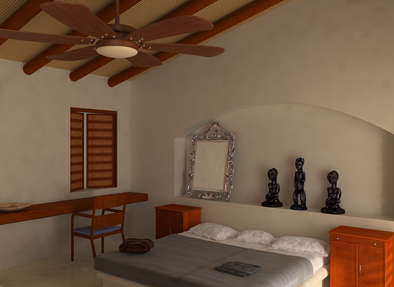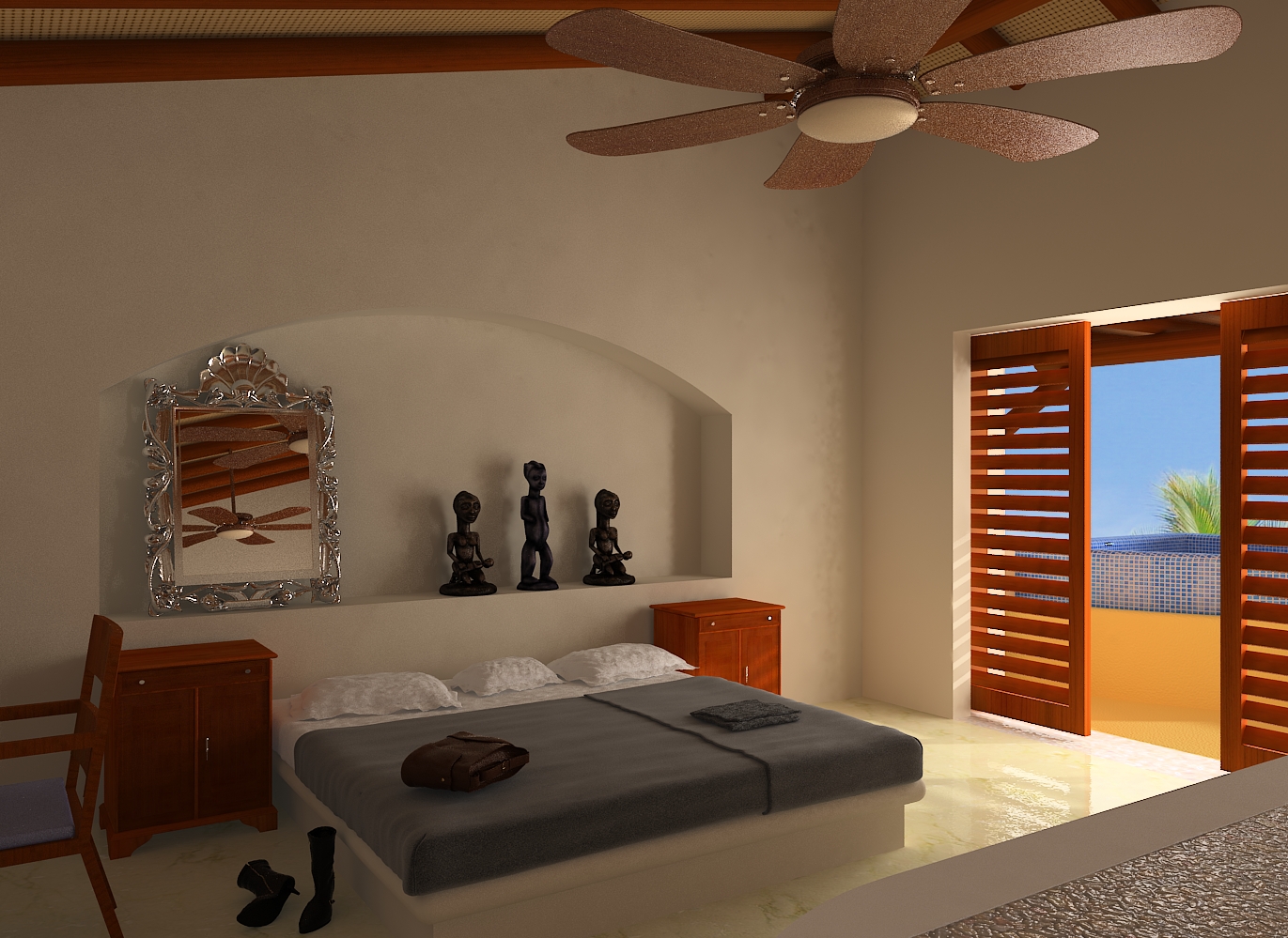 Bueno yo cambiaría la textura de la madera por una color haya, aunque la crítica debería ser al render y no al diseño. Así que cuidado con la saturación de la madera ya que veo que en donde le cae el sol se pone algo quemada, también le pondría algo de reflejo a la madera, así como la del ventilador, pero con más subdivisiones y cambiaría el fondo del dormitorio. Saludos y buena vibra.