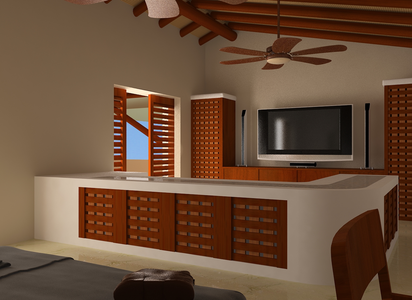 Veo que el agua esta sobre el borde del yacuzi (como se llame), aunque queda bien a esa altura, yo lo bajaría un poco ya que si entrara una persona rebosaria fuera parte del liquido. (esto es ya apurando renders hacia la realidad más pura, pero no hace falta que la bajes).