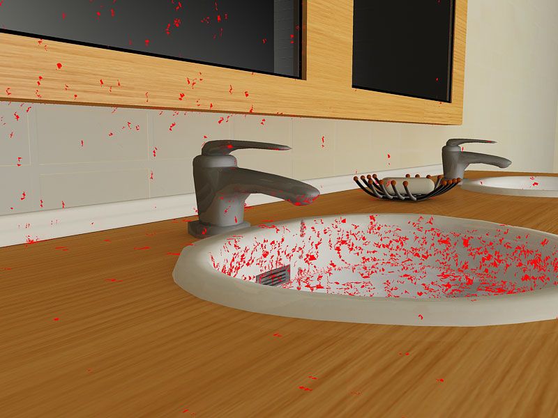 El material del espejo es Raytrace, anisotrópico, con reflexión. Al renderizar la escena si se me veía el reflejo de las paredes, pero al hacerlo sin Vray. Además, al renderizar con Vray tampoco aparecen las gotas del agua cayendo del grifo. Saludos.