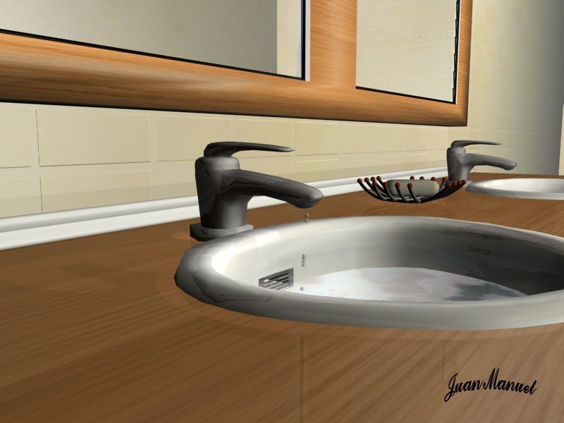 Juan Manuel, lo mismo que Shazam te digo. Trabaja un poco más el modelado si quieres conseguir fotorrealismo. Es muy raro ese lavabo con esa arista tan fuerte en la mesa. Y mira las barras metálicas de los reposabrazos. Necesitan más segmentos a lo largo para que sea más suavizado. Venga dale caña. Saludos.