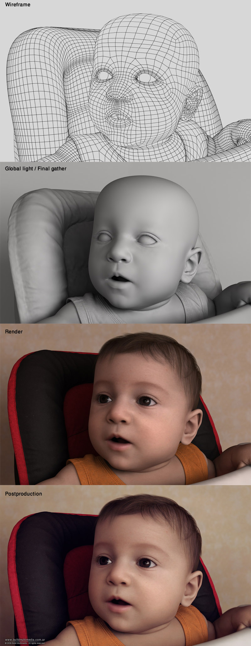 El modelado de la ropa y la silla está compuesto por texturas de alta resolución. En este caso fue enteramente modelado en LightWave ya que los nodos displacement me permitieron lograr lo que buscaba sin necesidad de usas otros software como Mudbox por ejemplo.