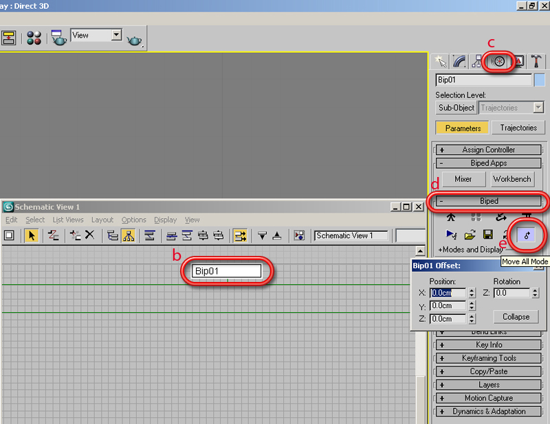 En la pestaña de motion del bípedo en el apartado Biped, hay un botón que es move all mode y con ese botón puedes mover a un personaje con su animación a donde quieras y empezara esta desde el sitio en el que le coloques.