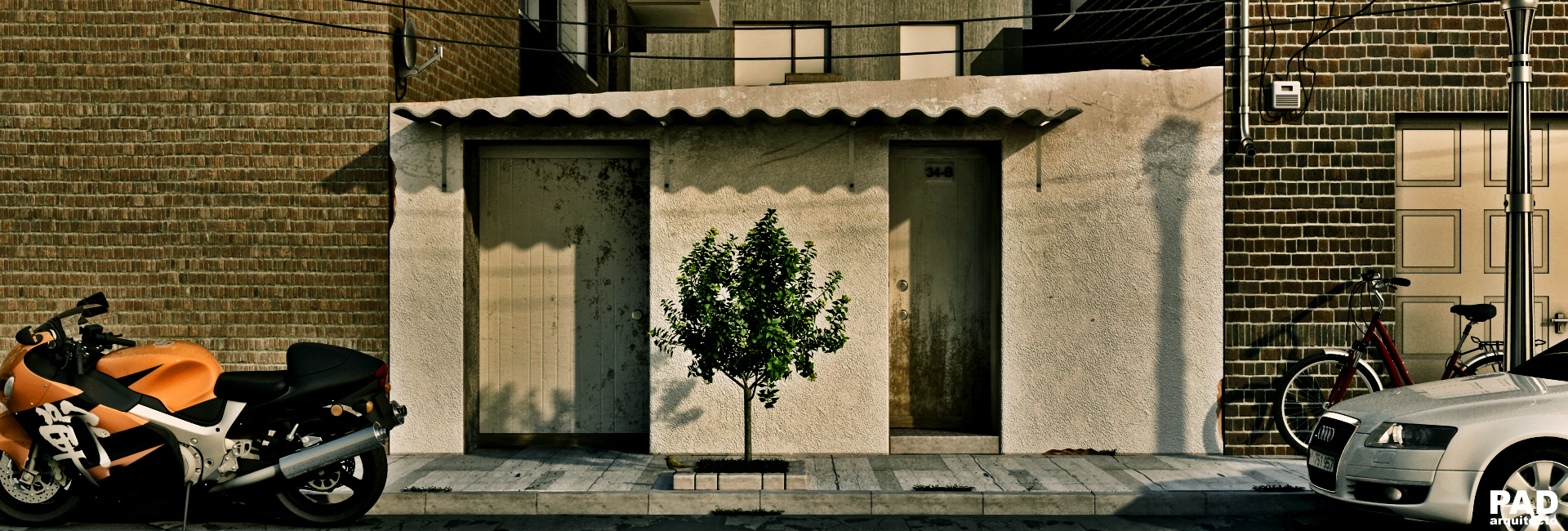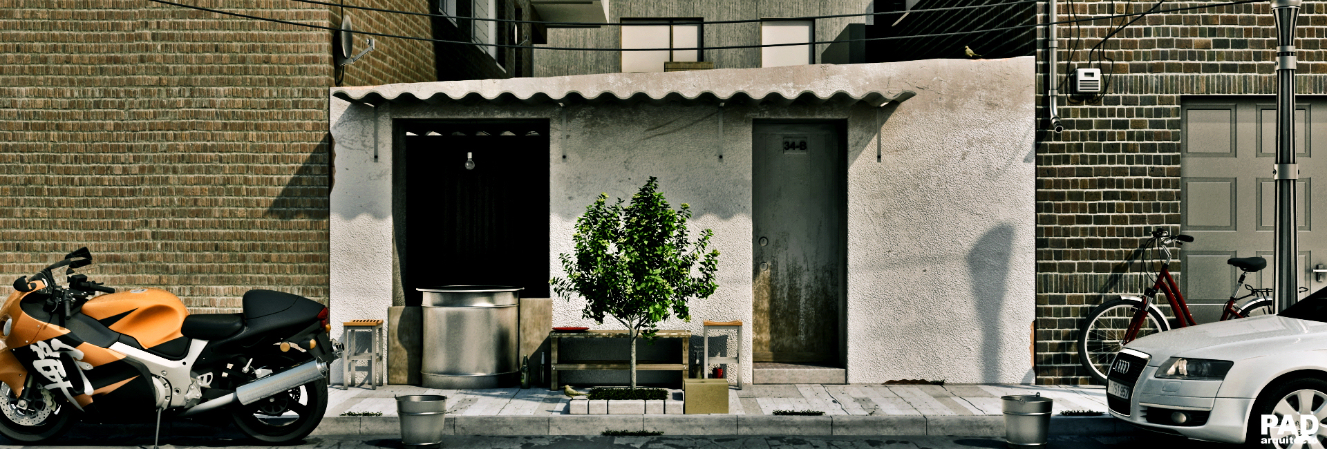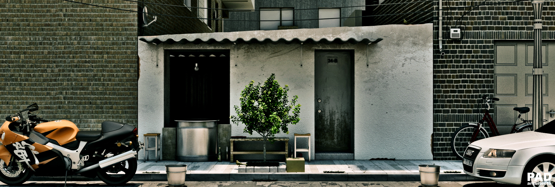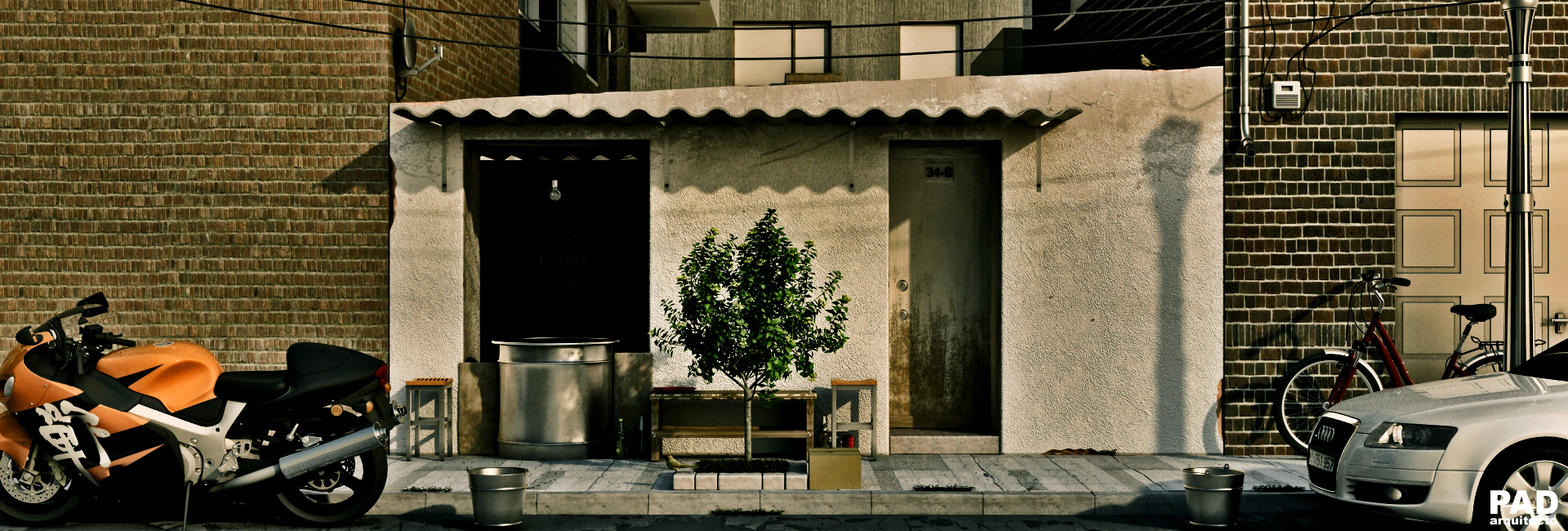 También me falla algo en los metales de la escena, los veo demasiado nuevos, estaría bien algo de imperfección, aunque veo que hay algunas imágenes que llevan esos cubos, también quitaría la moto. Un saludo.