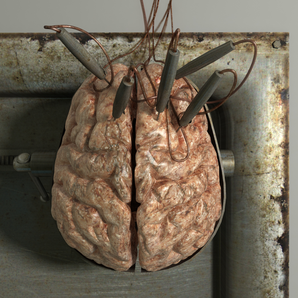 Gracias chicos. No sé cómo solucionar lo de los surcos del cerebro. Por una parte me costó bastante crear el material del cerebro y no quiero liarme ahora pasando la proyección a mapeado UV, por otra parte, la malla no tiene mucho detalle y al remarcar la geometría se nota. Voy a probar de usar el dirtmap de la 6.0 (creo que lo quitaron porque ahora el Ambient Occlusion es global) para crear una oclusión extra, a ver cómo queda. Sino, mucho me temo que se quedará así, pues aún tengo que crear todo el entorno y no tengo mucho tiempo y sí otros proyectos que hacer. Creo que soy un esclavo del tiempo de producción y ese es mi Samsara.