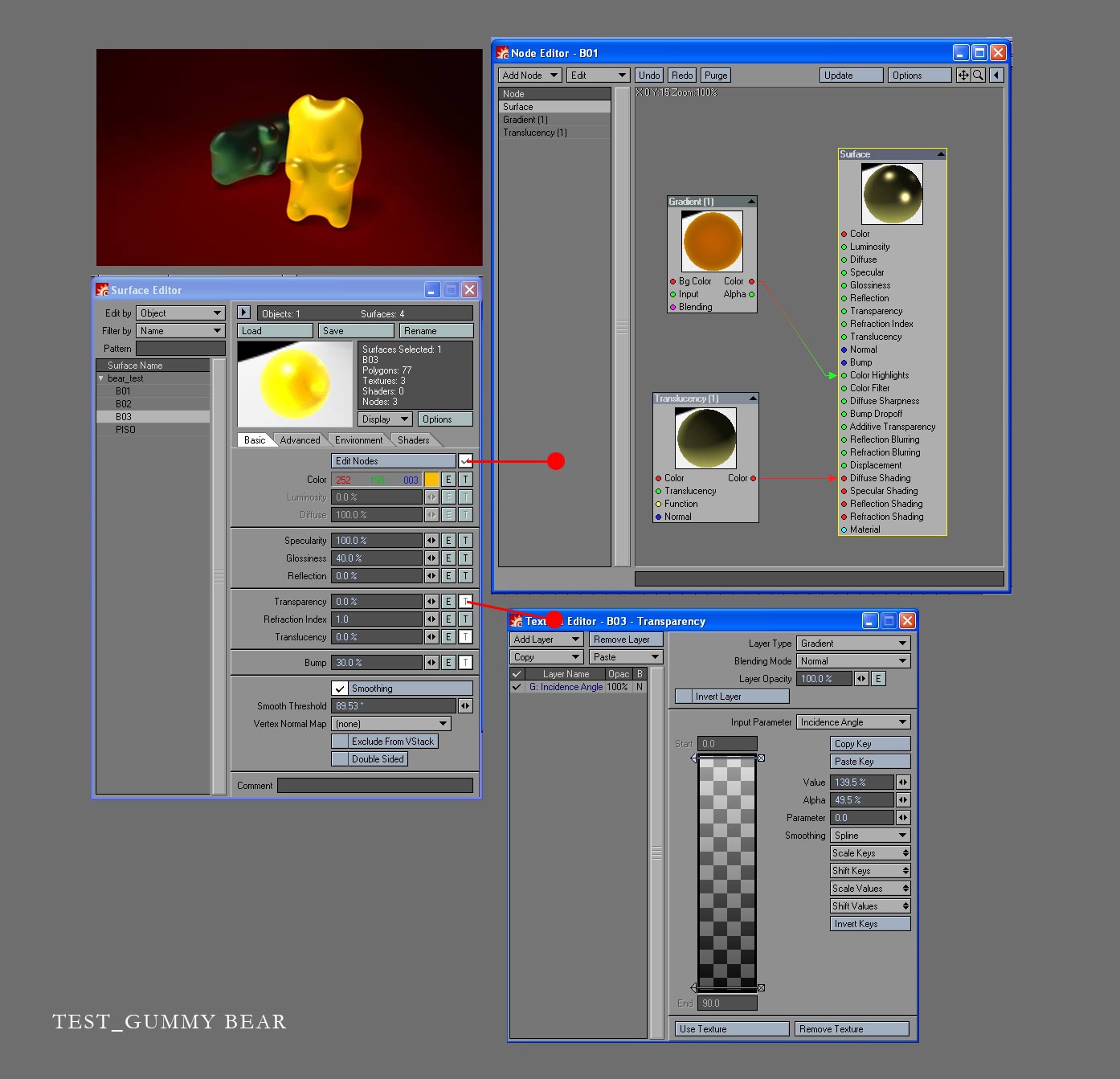 Qué tal chicos. Actualmente estoy utilizando LightWave 9.6, quisiera saber si tienen algún preset que simule la textura de los Gummy Bear (oos de gominola) o los parámetros por nodes o g2, la verdad que lo he intentado de muchas maneras, pero mis conocimientos no me dan para llegarle les agradecería si me pudiesen ayudar en la textura. Saludos, y gracias de ante mano.