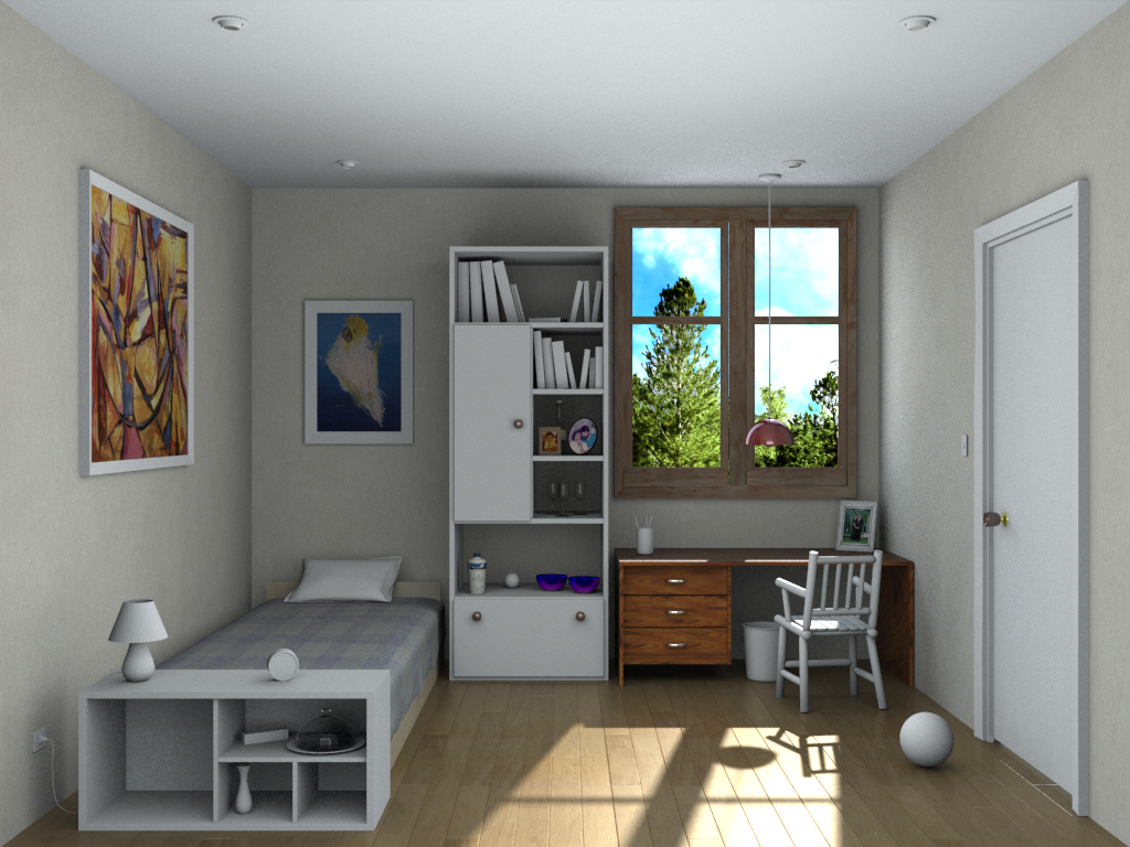 La escena la veo bien, pero me falla bastante la escala. Ejemplo, parece que la lámpara que cuelga del techo esta colgada de un cable de 2 metros. La cama parece muy baja. Creo que podría ser por el ángulo de la cámara. Por lo demás no está mal.