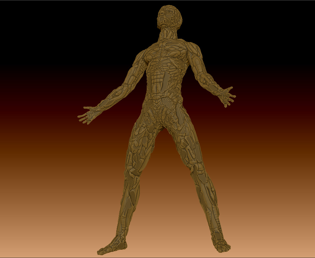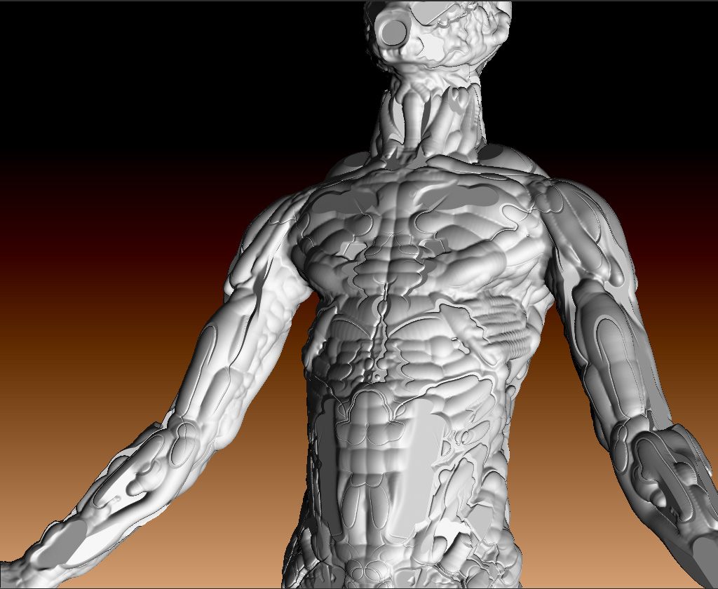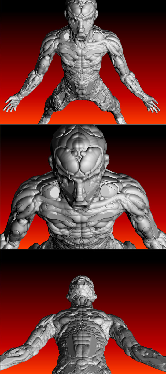 Aún me queda bastante modelado del omescuro, pero no he podido resistirme a lanzar un render (Cinema 4D, pasado desde z con decimation), no está afinado ni mucho menos, pero más que nada para ir viendo cómo funciona el personaje. Saludos.