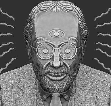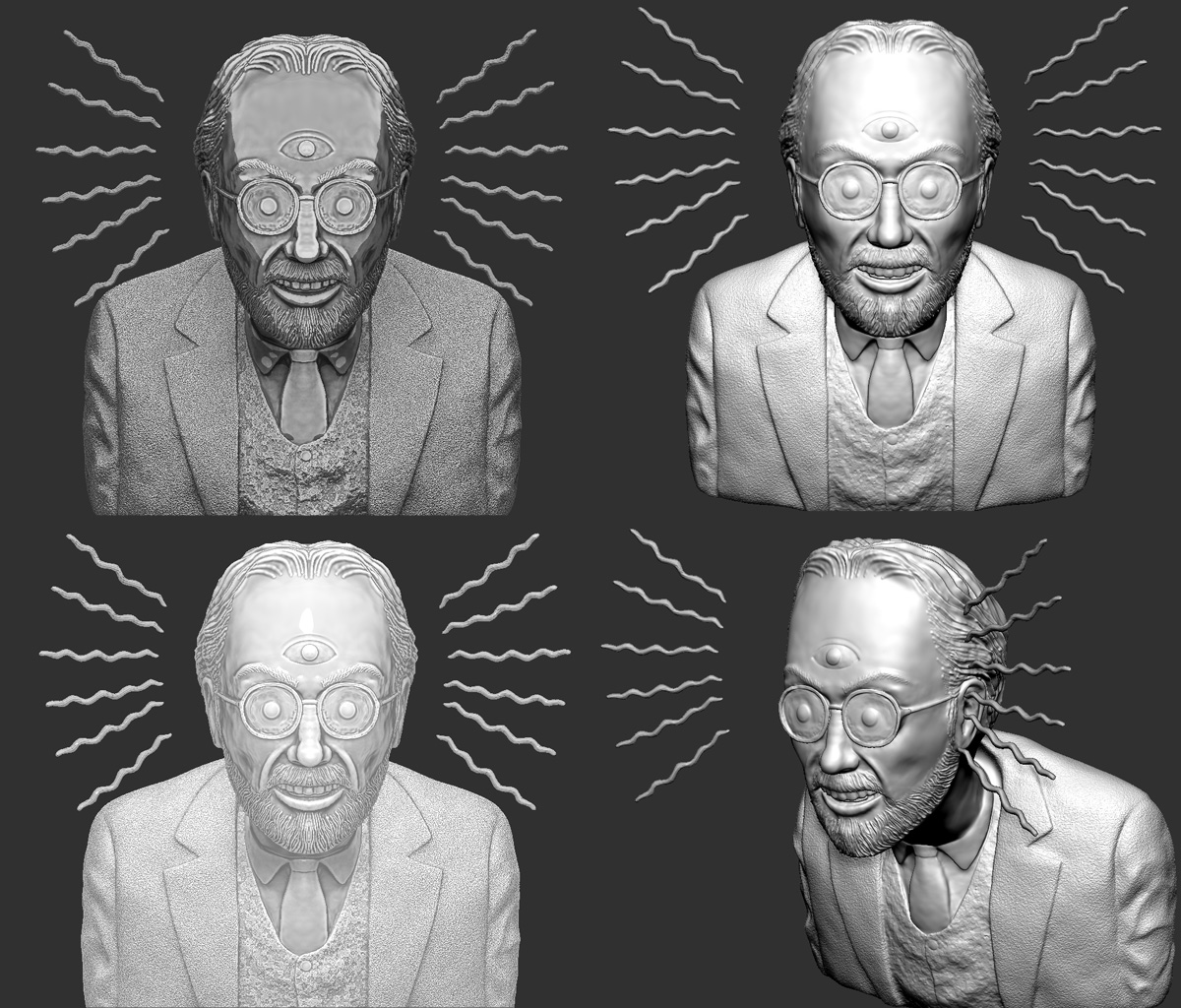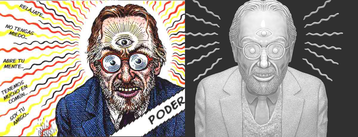 Casualmente por la red me encontré con una ilustración de mi querido drugo Robert Crumb, y me dije:ala, a 3d, no me ha resultado baladí la cosa en principio, ahora estoy disfrutando, pero hay algo que se me escapa, no acabo de ver esa superexpresión del original, a ver si veis lo que falla antes de continuar, yo es que estoy quemado de remirarlo, y no me gusta saltar etapas y empezar con pruebas de texturizado antes de verlo bien claro, para los rayitos del tercer ojo tengo pensado hacerlas en 3d, como las exteriores, pero pienso que la falla no está ahí.umm, está modelado de una pieza, tal vez debería hacer subtool: gafas por un lado, traje por otro, la perspectiva. Un saludo.