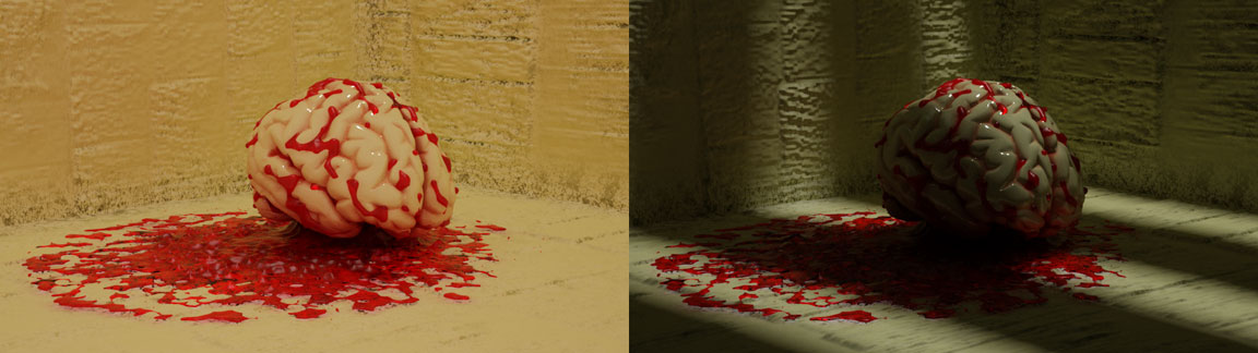Me parece que podrías lograr el efecto trabajando las texturas y desplazamiento, en si lo que se vería sería una serie de ramificaciones rojas sobre la superficie del cerebro, y una que otras manchas de sangre.