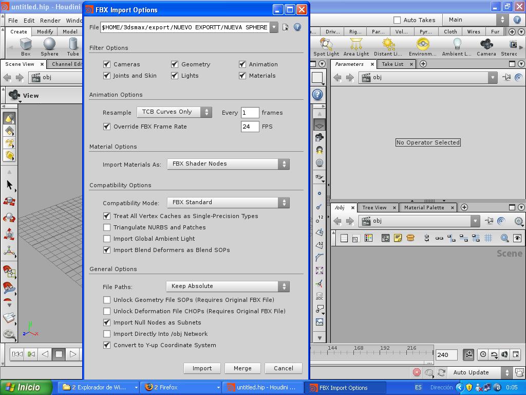 Esta es la forma en la que exporto de 3dsMax e importo a Houdini. En Houdini aparece la geometría pero sin animación.