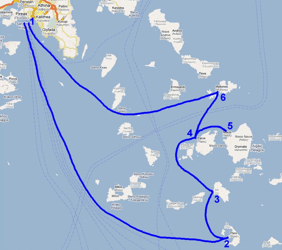 Mapa de ruta: Atenas - Santorini - IOS - Paros - Naxos - Mikonos - Atenas.