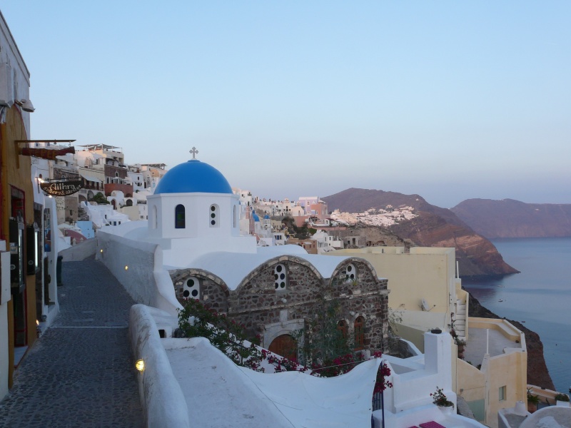 Oia es el pueblo más al norte. Se llena de gente que contempla extasiada cómo se pone el sol, mientras no se percatan de los perros en los tejados.