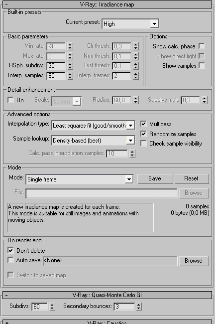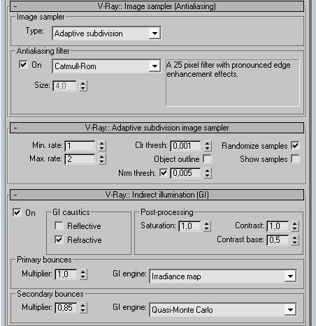 Hola Franhegar. Pues estoy mirando ahora mismo eso, lo de los diferentes tipos de antialiasing. Los de las luces están bien, (por eso me daba el ruido, luego me di cuenta) pero las subdivisiones de los materiales? No tengo muy claro a qué te refieres, lo que hay debajo de reflact y refract, ¿no? Que suele estar a 8 por defecto. Voy a echarle un ojo a eso.
