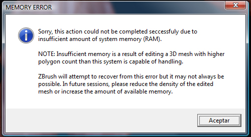 A mí me pasaba, cambié de máquina (tenia una máquina muy pobre) y ahora no tengo ese problema (ahora tengo 8 gigas), el máximo de memoria de ZBrush creo que son 4 gigas.