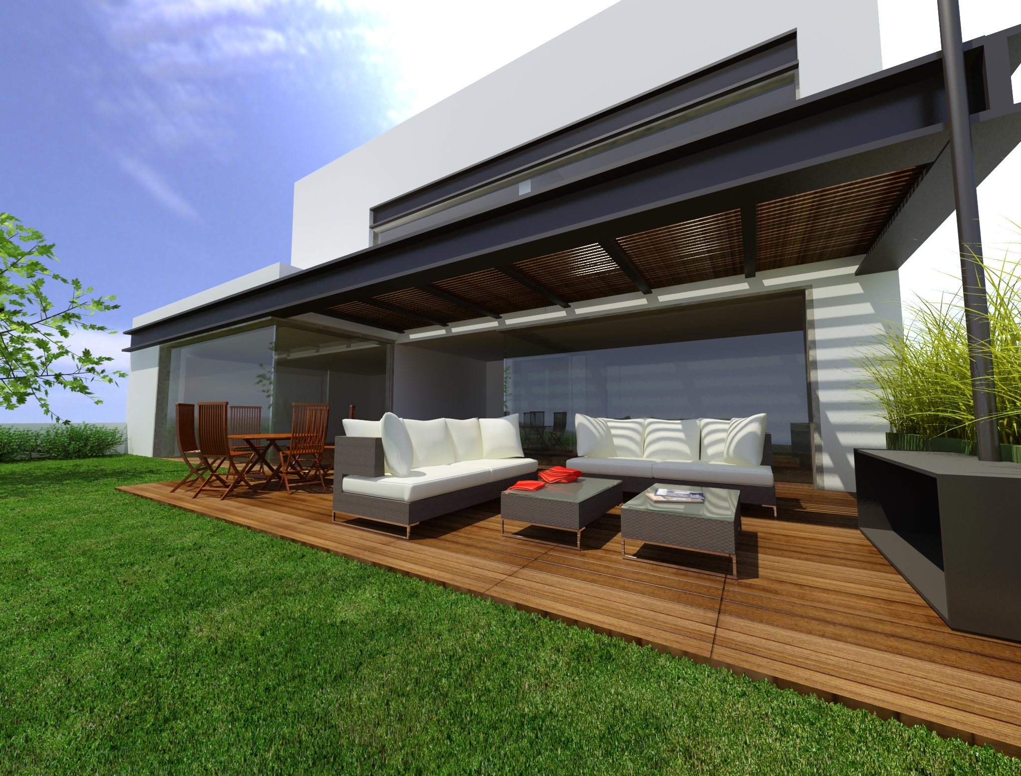 Hola, en esta imagen también tienes problemas de antialiasing, y el ángulo de la cámara lo veo para mí gusto demasiado forzado, la textura de la pérgola o de la madera de la pérgola se ve un poco repetitiva, y el cristal de la terraza esta reflejando el infinito, podrías haber puesto un plano con alguna imagen para que la hubiera reflejado y eso le hubiera dado más realismo al cristal. Un saludo.