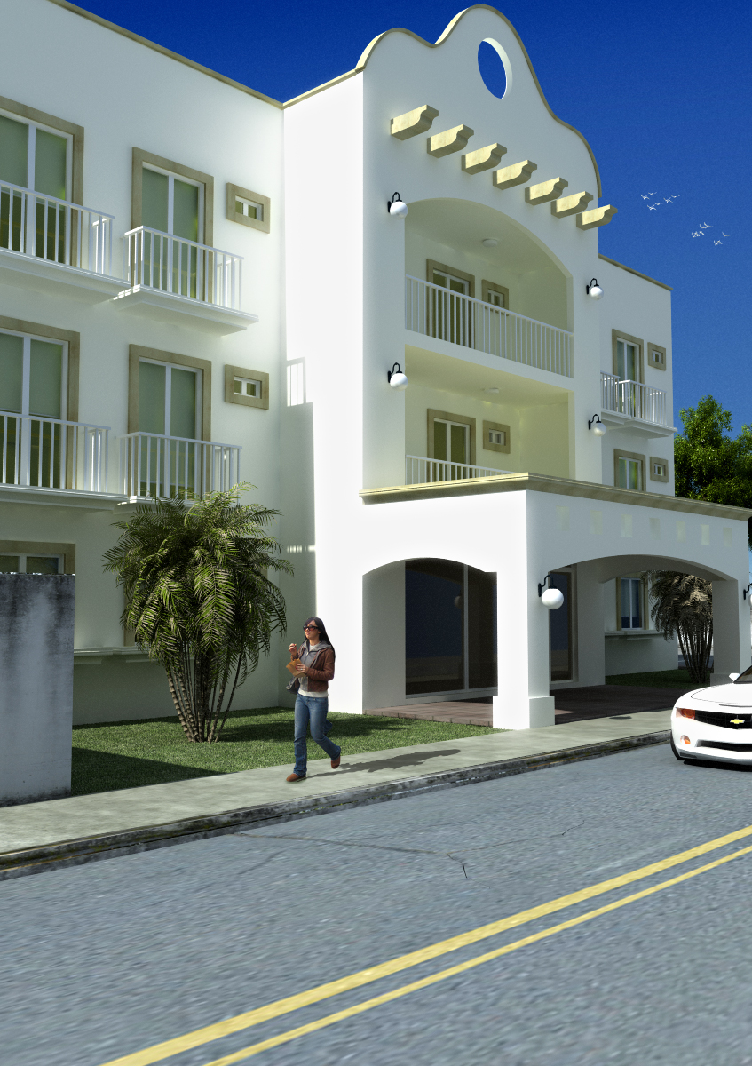 Bueno a mi parecer, la base de las columnas de la entrada en blanco sería fatal y lleno de suciedad, prueba con algún revestimiento. Del mismo modo con la zona cercana al Grass un pequeño zócalo para alejar el Grass del blanco. Esa textura color arena tiende a verse repetida en algunas zonas. Define mejor los agujeros cuadrados que no se aprecian. El Irradiance Map también se ve mal en las esquinas de los balcones. Prueba con eso y a ver qué tal va mejorando.