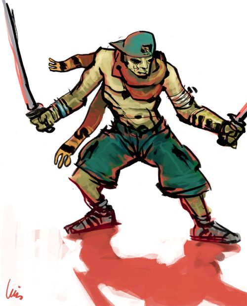 Vaya, lo de los cuatro brazos es verdad, y ahora aún se distingue un poco, que si llegas a verlo sin colorear te pierdes, de todas formas, es una de las cosas que me gustaban del dibujo, la confusión inicial. Aunque como ya he dicho a nadie le entusiasma el dibujo.