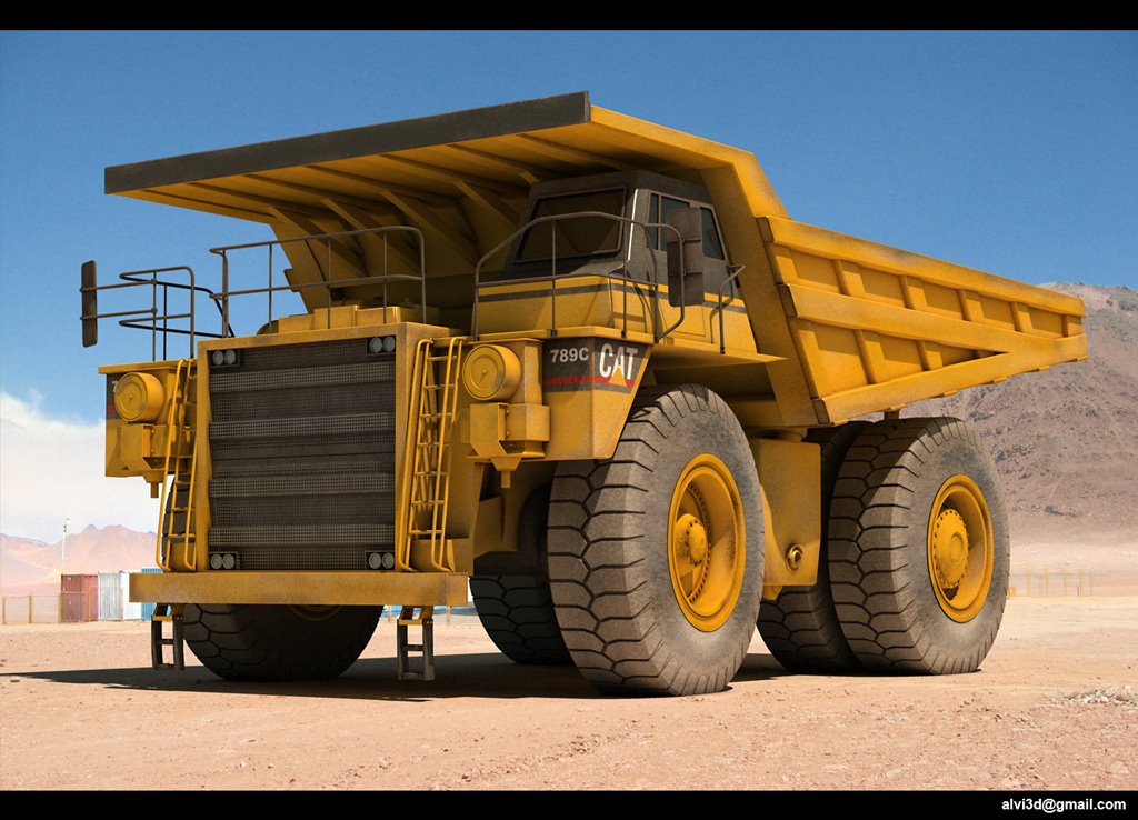 Este modelo es el caterpillar 789c, está hecho con Cinema 4D. Es un camión de los utilizados en las minas, carga unas 100tm y para que os hagáis una idea del tamaño, ya que no he puesto ninguna referencia, las ruedas miden 3 metros.