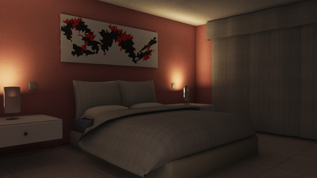 Veo demasiado ruido, no sé si es porque los samples de las luces, o problemas con el FG. Por otro lado, me da la impresión de que la cortina tiene la misma textura que al colcha, se ve muy rígida, y pues ese color zanahoria de la pared tampoco es que, ayude mucho.