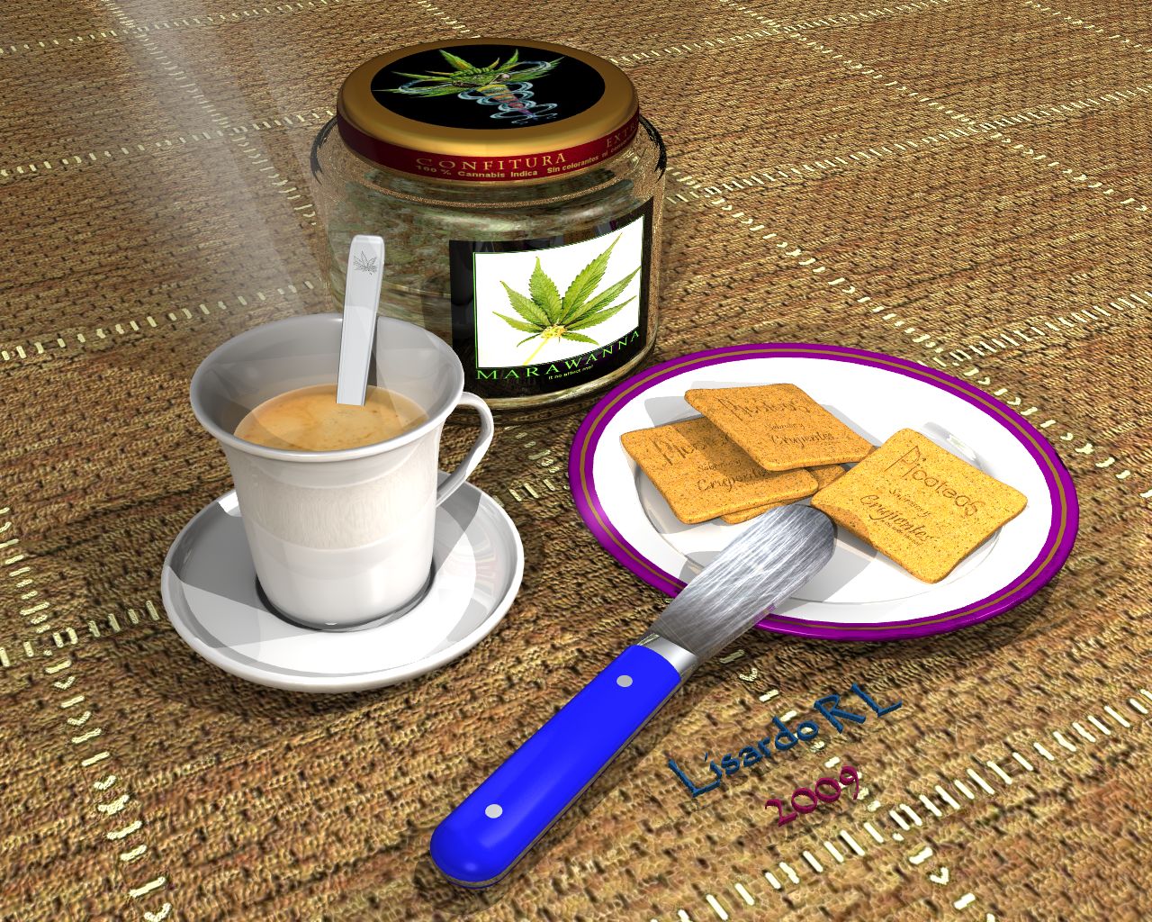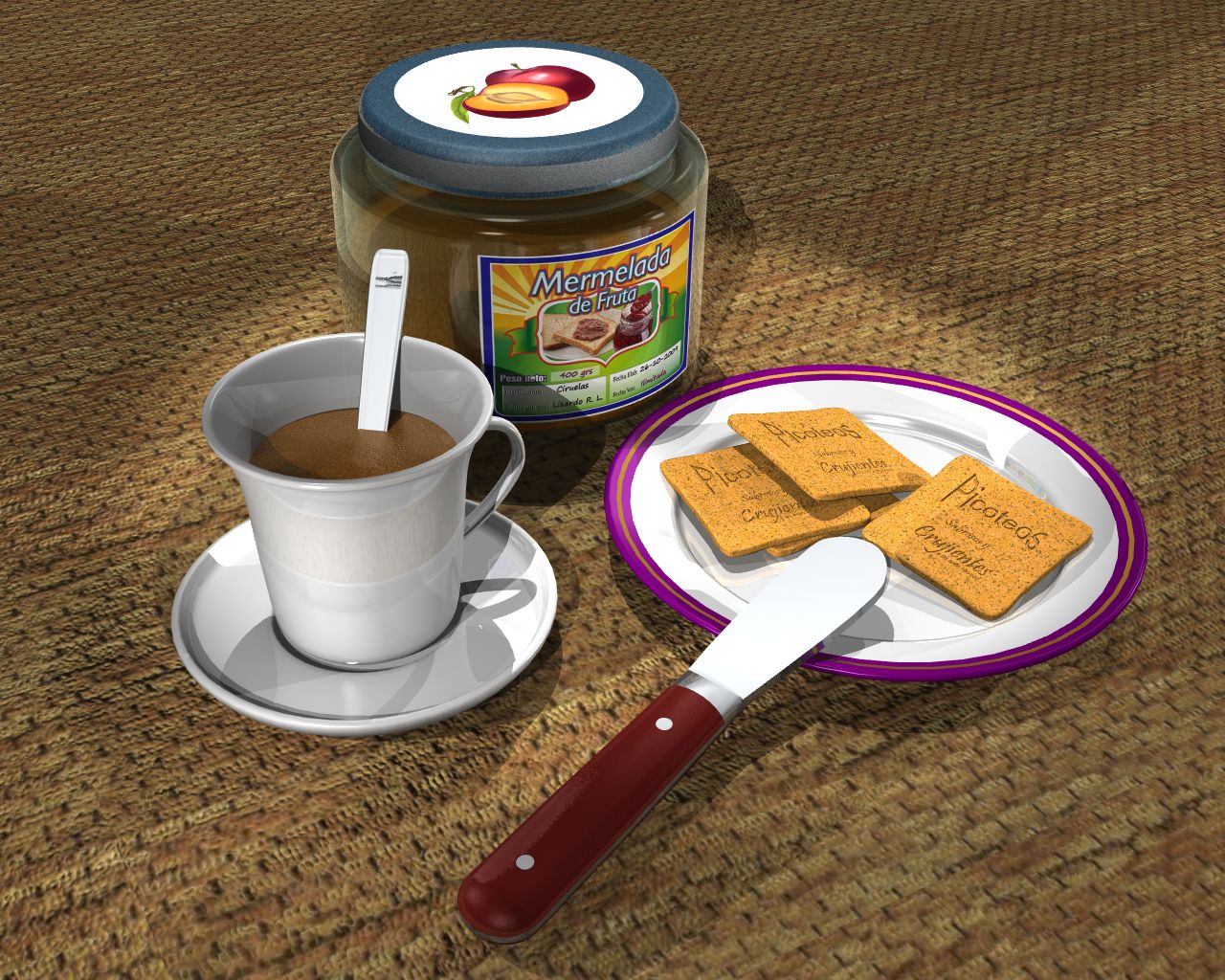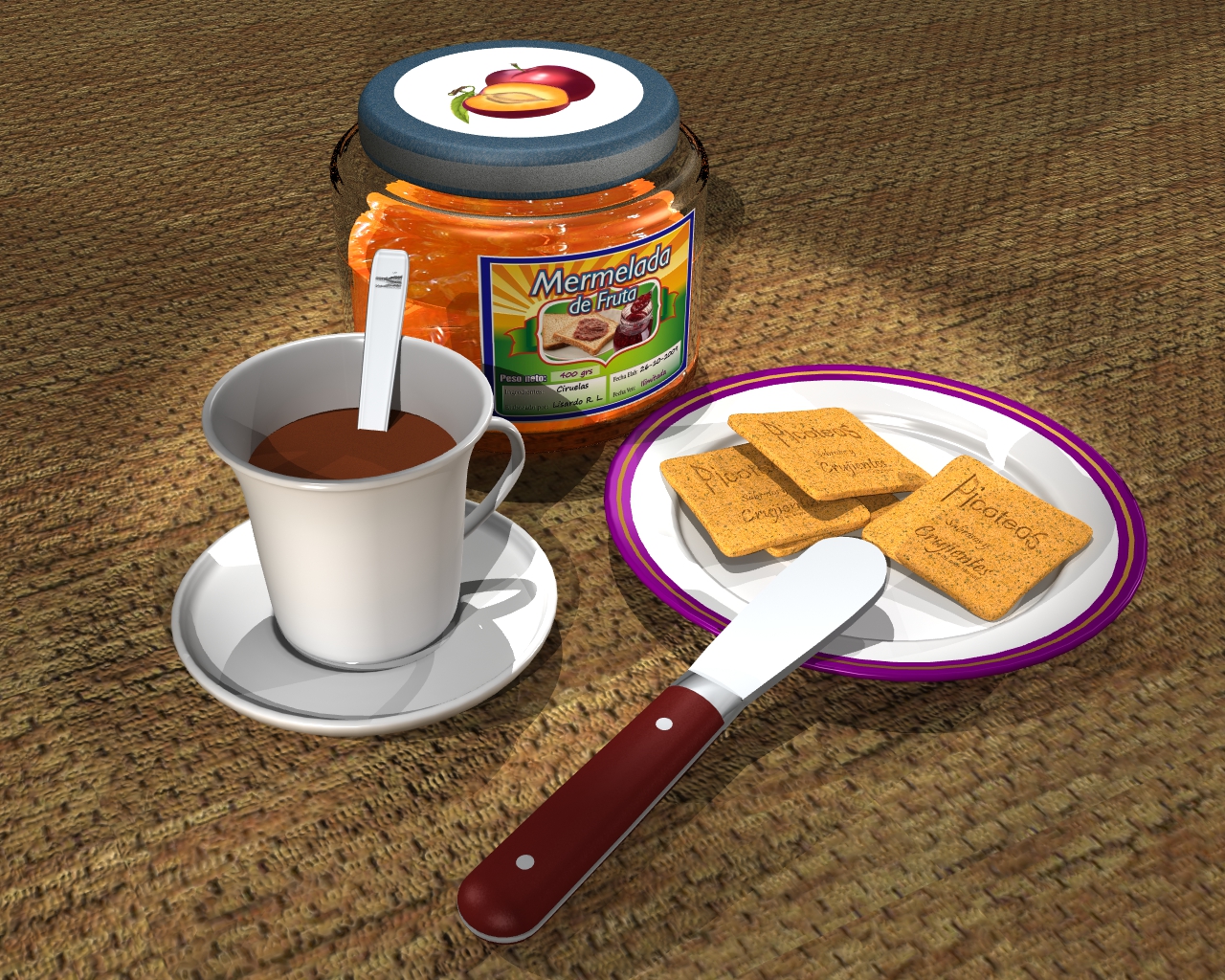 He cambiado la iluminación, añadido una nueva textura para la hoja del untador, para la confitura y de paso un poco de humo al café, bueno por hoy ya es suficiente, mañana le daré otro repaso, tengo que despegarme del monitor para que la vista descanse un poco, cuando este de vuelta seguro que veré el render con otro punto de vista. Saludos a todos.