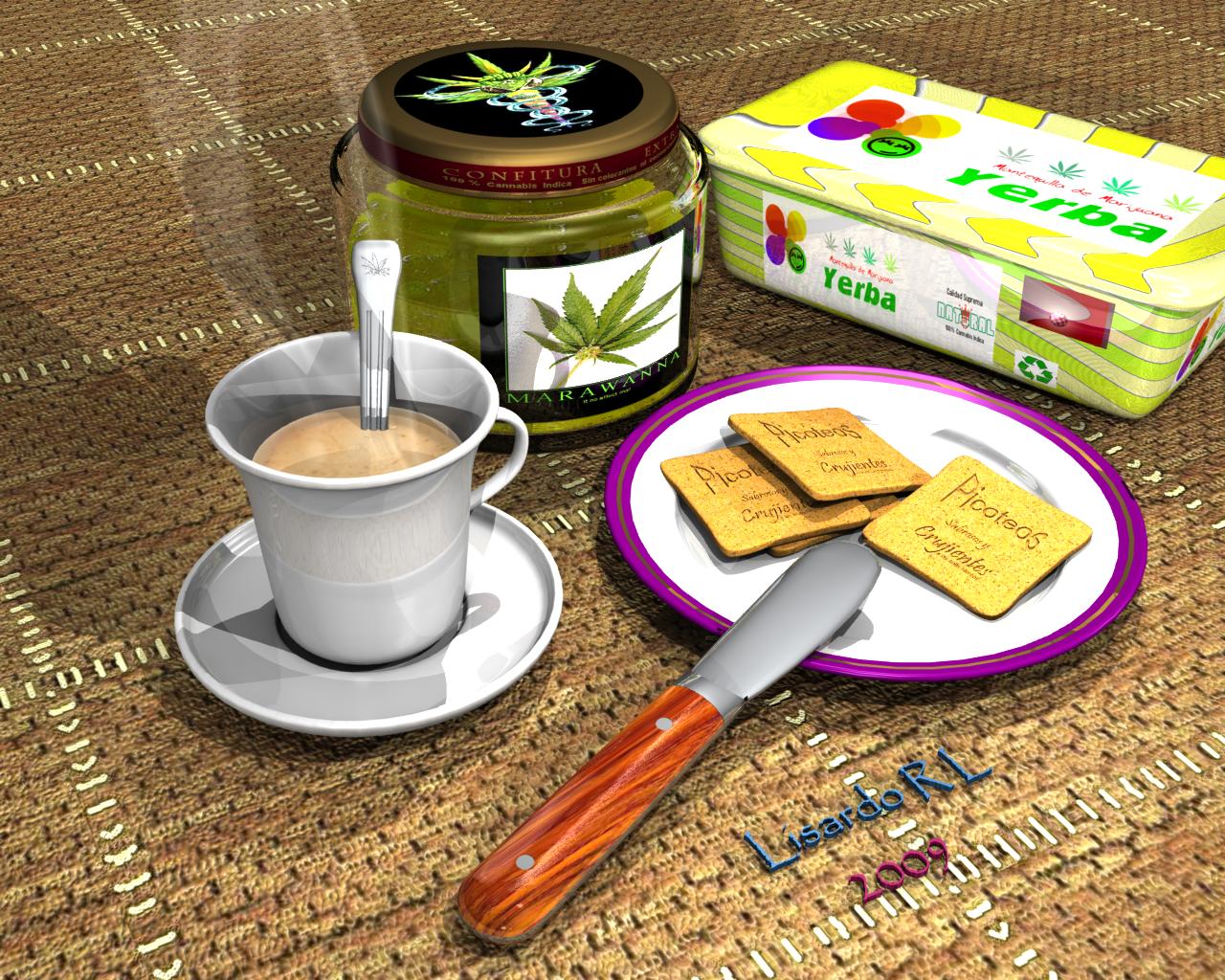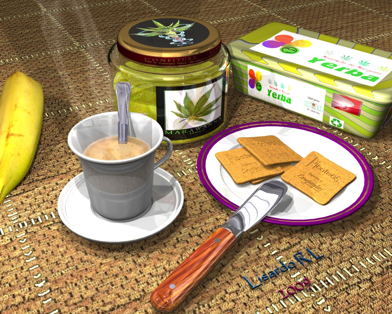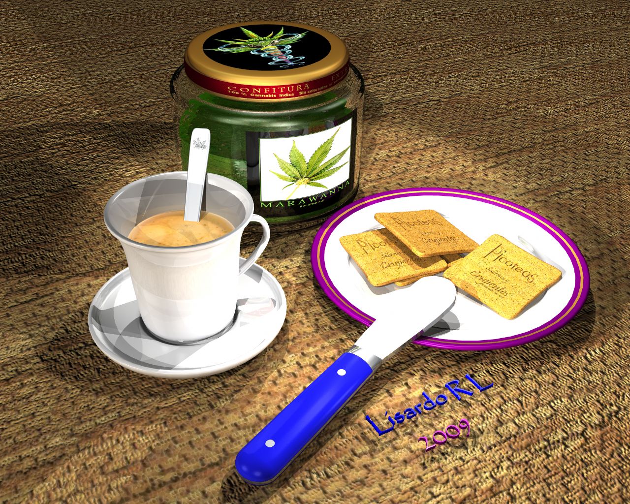 He cambiado la iluminación, añadido una nueva textura para la hoja del untador, para la confitura y de paso un poco de humo al café, bueno por hoy ya es suficiente, mañana le daré otro repaso, tengo que despegarme del monitor para que la vista descanse un poco, cuando este de vuelta seguro que veré el render con otro punto de vista. Saludos a todos.