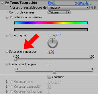 2. Aplica el efecto corrección de color/tono saturación y reduce la saturación maestra a -100.