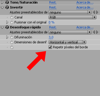 8. Al video original aplica tono/saturación con los valores saturación maestra:-5 y luminosidad original:30. Aplica también desenfoque rápido con difuminación de 35.