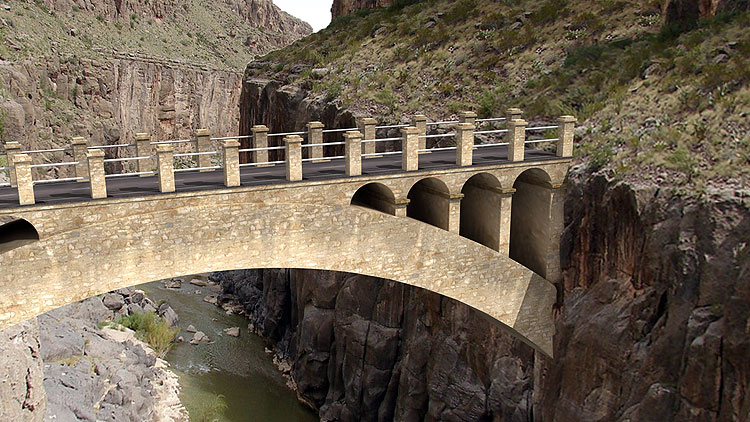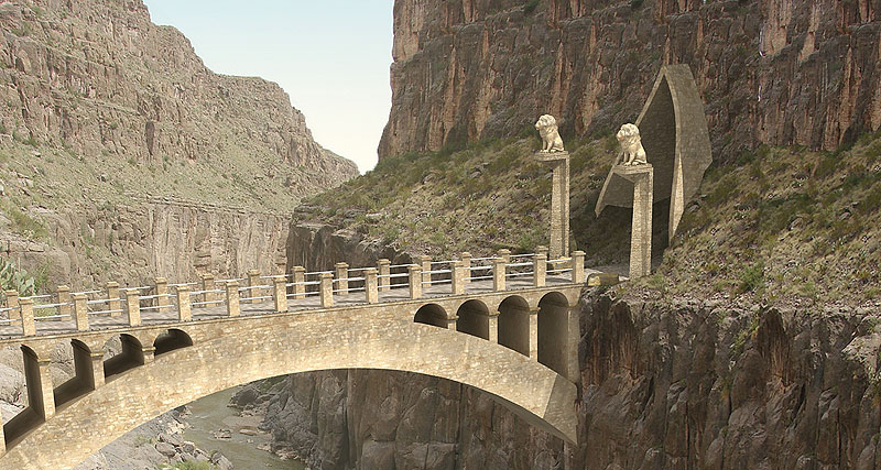 Si quieres también podrías romper alguna columna y algún que otro pivote del puente, así le daría un aspecto mucho más interesante, más misterioso.