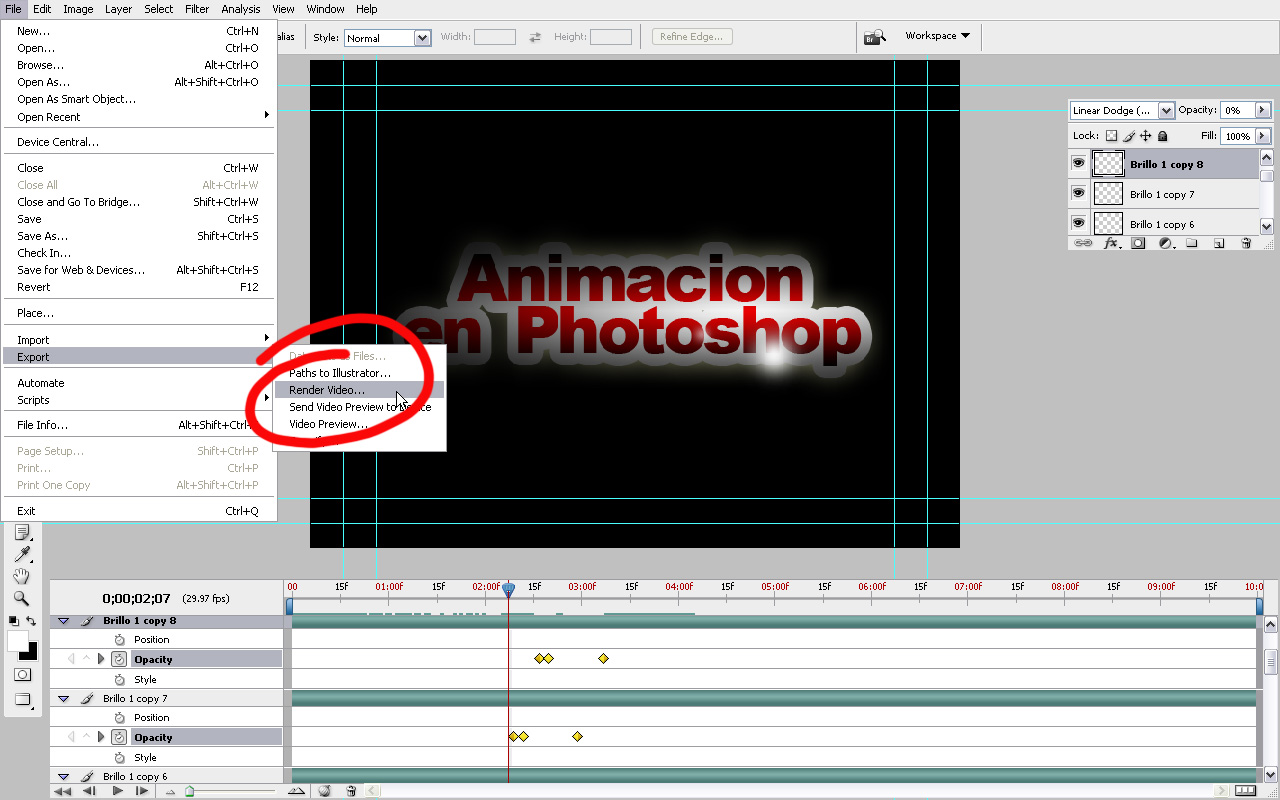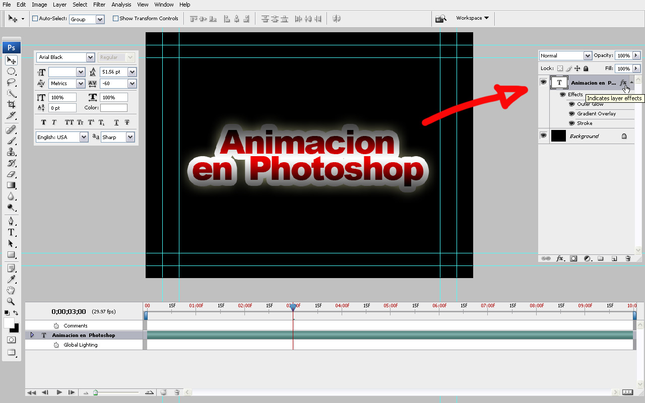 Así obtenemos una animación muy sencilla desde Photoshop, con una luz iluminando el texto y algunos puntos que funcionan como partículas brillando sobre este.