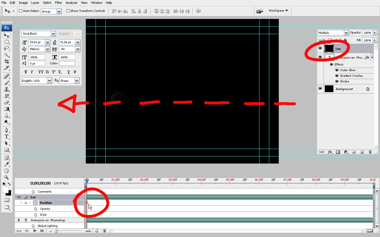 5. Ok, aquí empieza la animación: asegúrate que estas ubicado en el primer cuadro de la animación y desplaza tu layer de degradado hasta dónde más puedas a la derecha. Enseguida haz click en el cronómetro de posición para crear un keyframe.