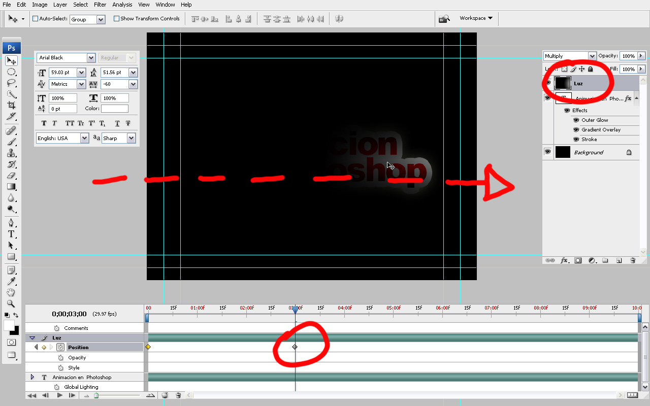 8. Ahora sencillamente duplica ese layer arrastándolo al icono de nuevo layer. Enseguida ubica este punto más hacia la derecha sobre el texto. Y por último selecciona los keyfames de opacidad y los desplazas más adelante en la línea de tiempo.