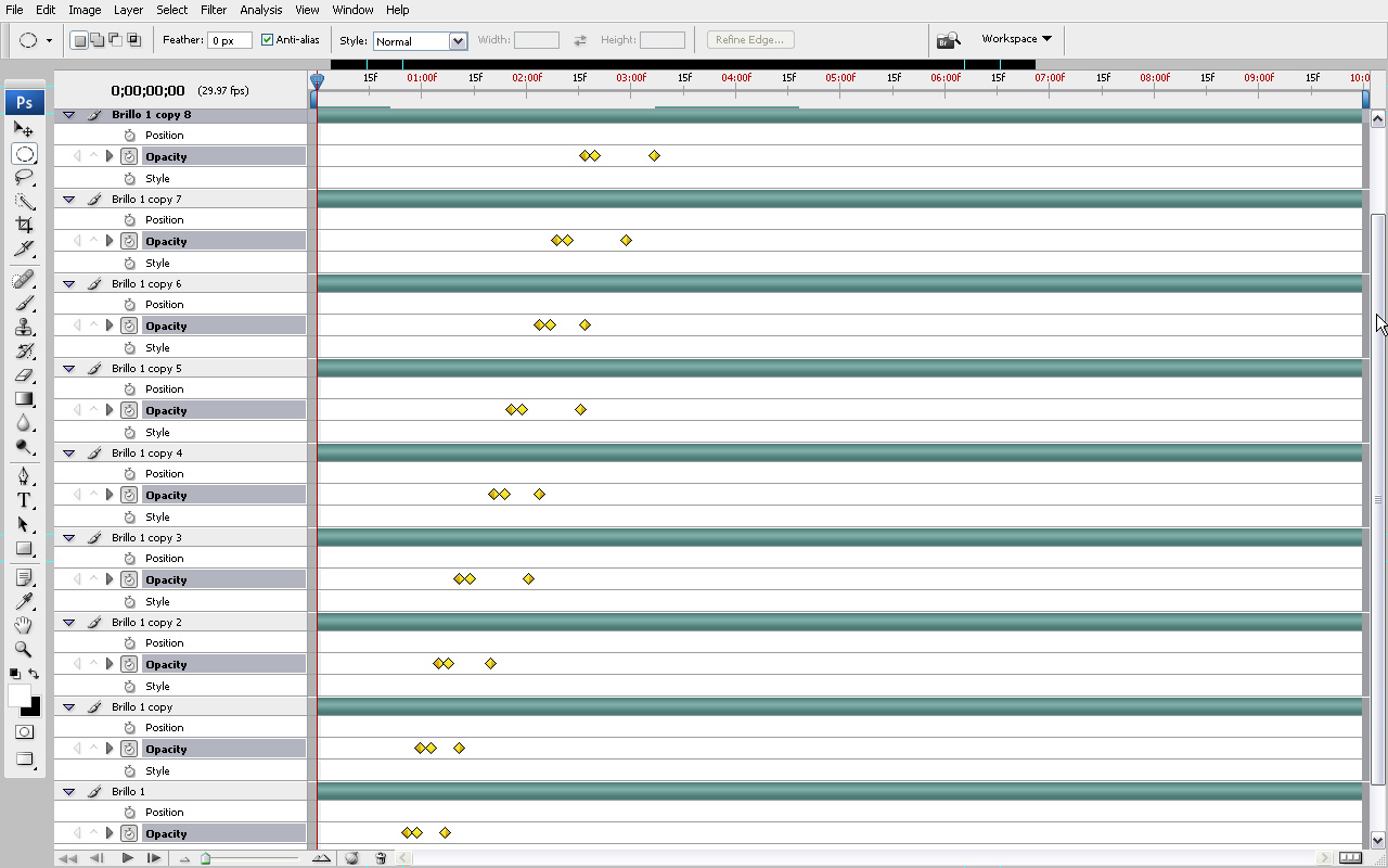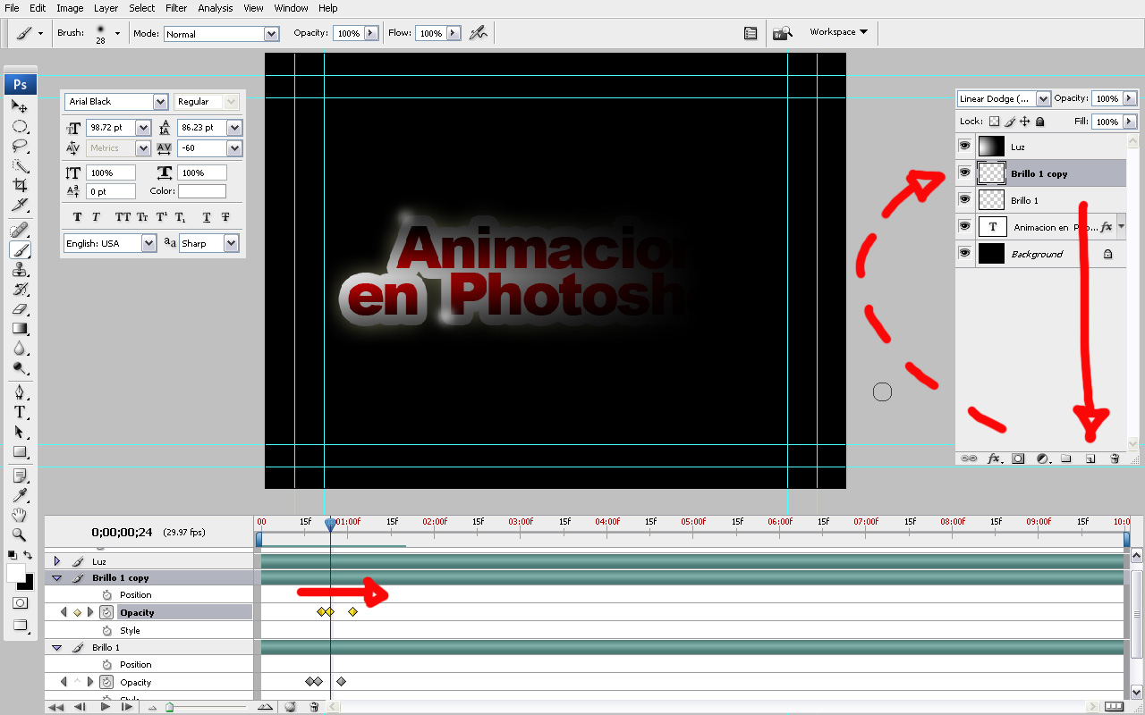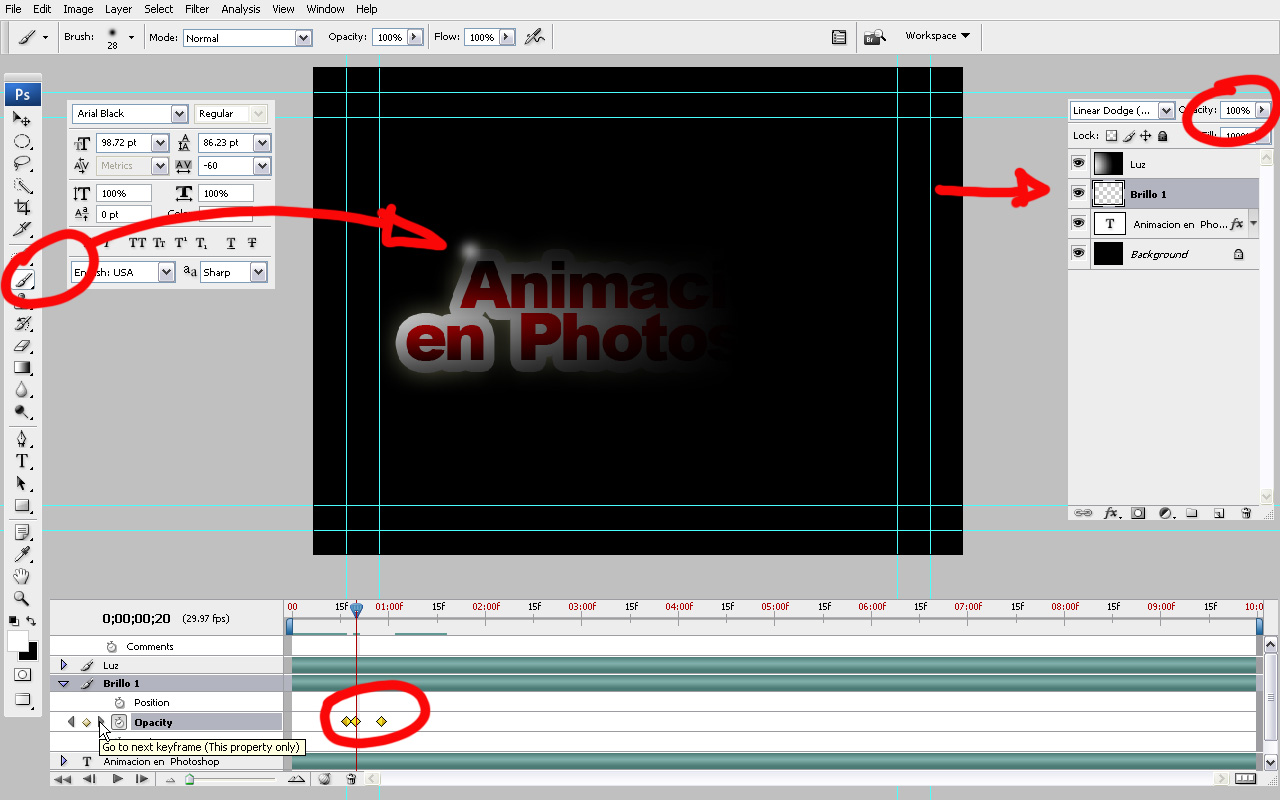 7. Crea un layer nuevo, en medio de los dos que ya has creado y con la herramienta de pincel haz un punto con borde muy suave. Pon ese layer en el modo de transferencia linear dodge (add). Ahora vas a crear keyframes de opacidad para ese layer de la siguiente manera: cuando tu degradado (que simula una luz) haya dejado ver el comienzo del texto pon la opacidad al 0% y oprime el cronómetro para crear el primer keyframe, unos cuadros más adelante pon la opacidad al 100% y aún más adelante vuelve a ponerla al 0%.