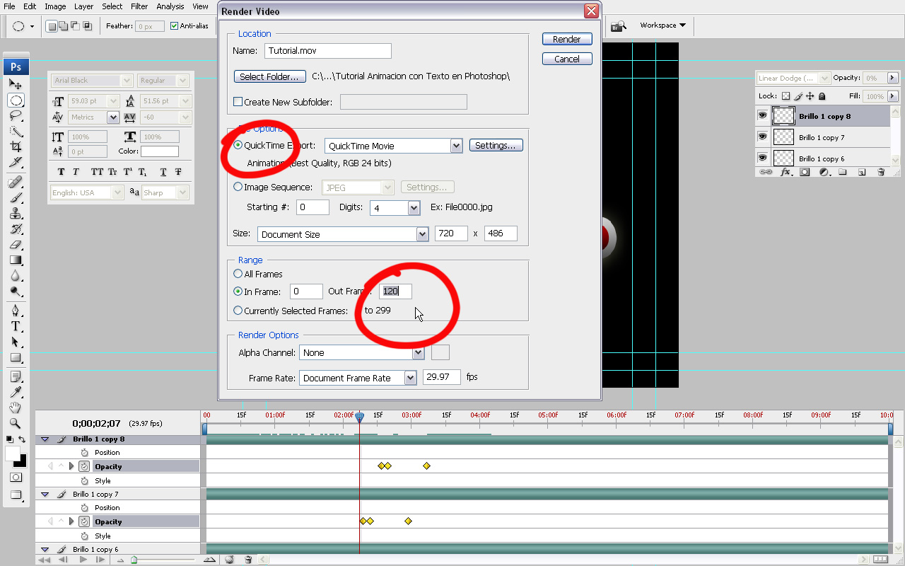 11. No queda más que exportar la animación como vídeo y dejar como rango 0 a 120 frames (es decir, 4 segundos a 30 frames por segundo).