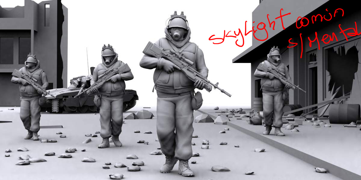 Adjunto lo que tengo testeado. Es un boceto bastante chapucero, pero me sirve para probar la cámara, luz y demás cosas antes de ponerme a modelar todo el entorno. Evidentemente lo que hay ahora es de prueba, igual que los muñecos clonados.