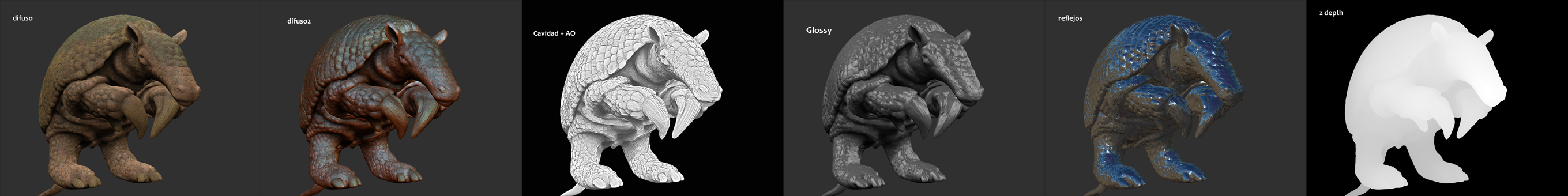 Pues mira la realización de este es bastante sencilla solo pinté el Diffuse con el polypaint de ZBrush y lo demás fue sacar render con materiales que se adaptaran al render final que tenía en mente lo demás fue componer en Adobe Photoshop con más maña que otra cosa.