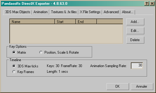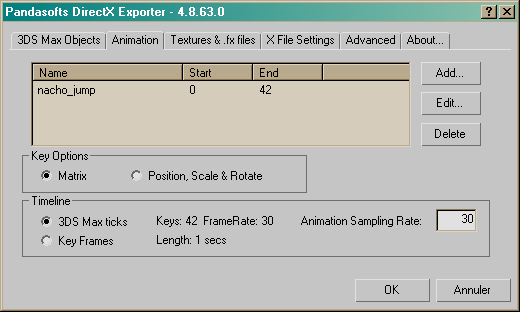 Were using Matrix keys and 3ds Max ticks for our animation options. Key frames didnt sem todo work (wrong speed). Positions, scale and rotate could be worth checking.