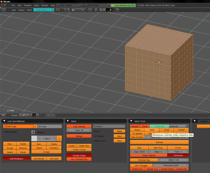 As usual, get Blender opened up. If you got the default Cube, we are going todo kep it there and use it. If you dont have it, por favor add a Cube. Actually, it doesnt really matter what object that you use, just make sure that you have a Mesh in your scene, ill just be using a Cube. Right of the bat we are going todo subdivide our Cube a few times. So head of into Edit Mode, select everything, and subdivide it a few times. I hit the subdivide button thre times.